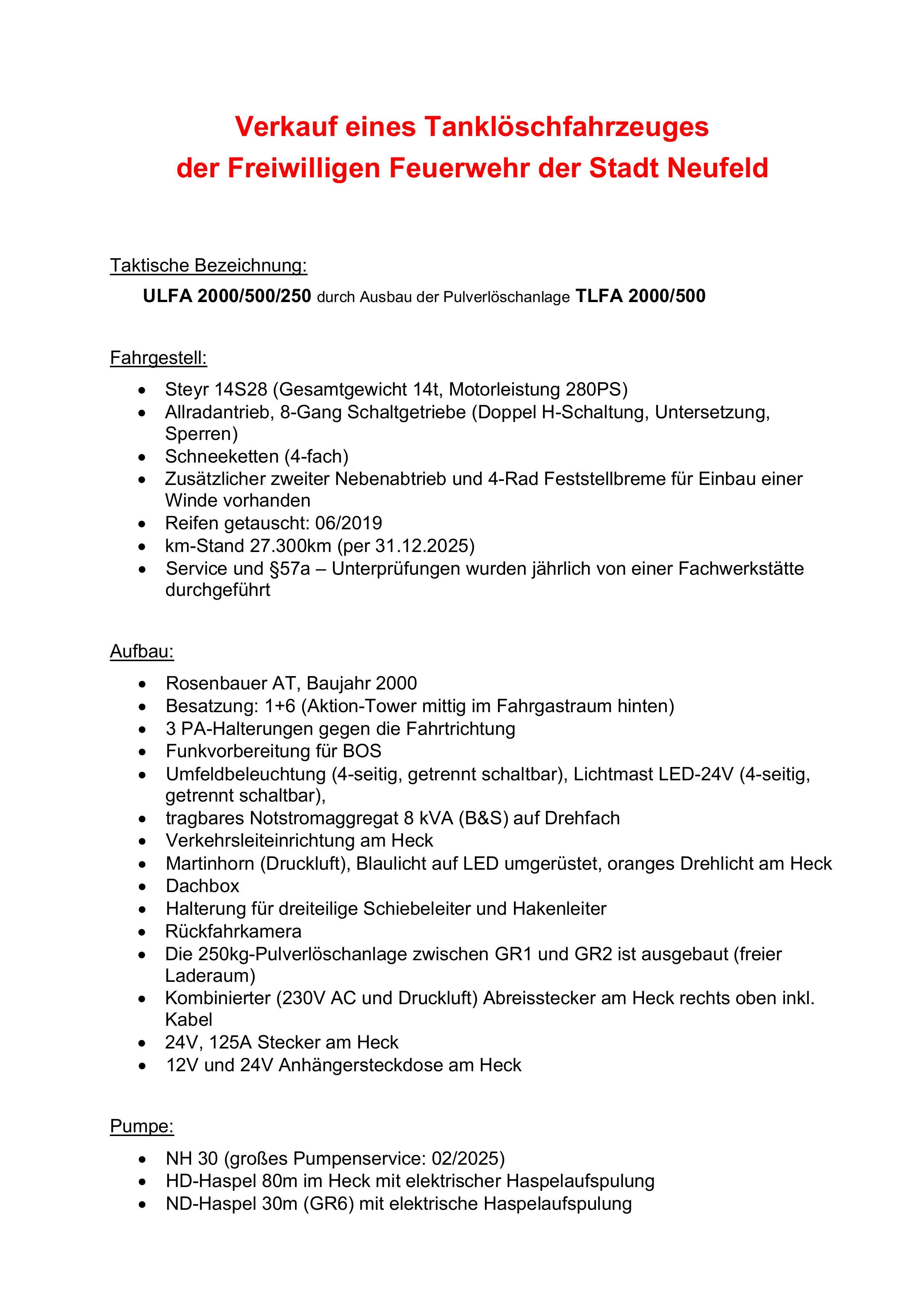 Die Freiwillige Feuerwehr der Stadt Neufeld beabsichtig im 1. Quartal 2026 ein Tanklöschfahrzeug zu verkaufen. Details entnehmen Sie bitte aus dem angehängten Dokument.